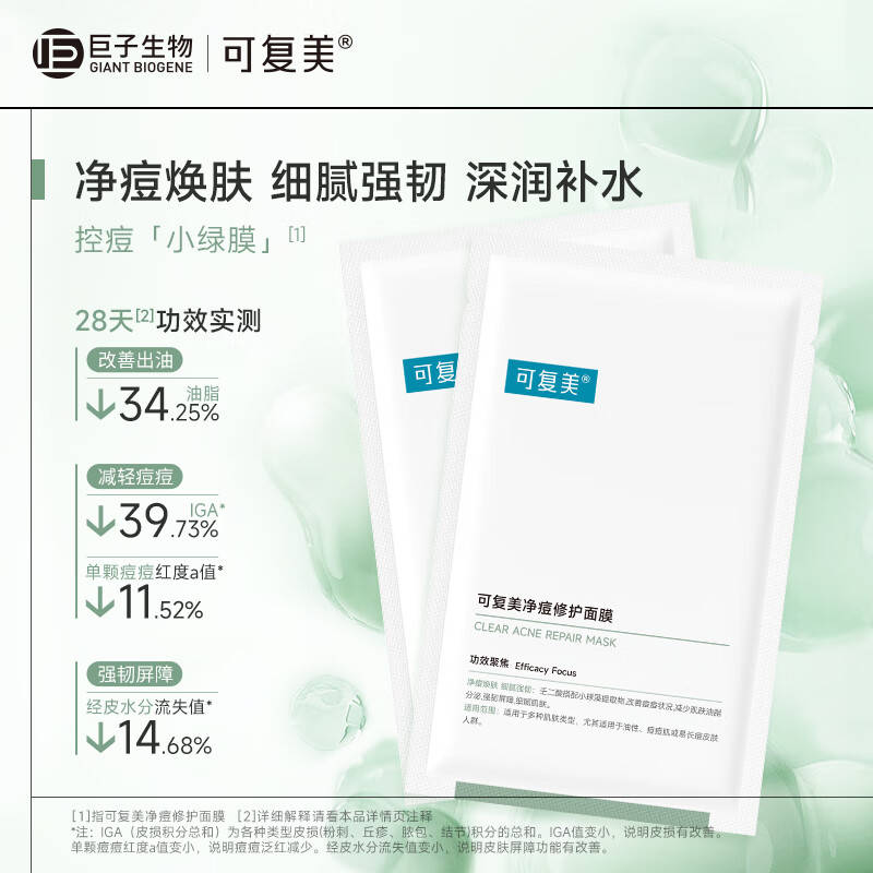 可复美的净痘修护面膜专为痘痘肌设计,采用天然成分,温和不刺激。它的膜布设计更是提升了精华液的吸收率。